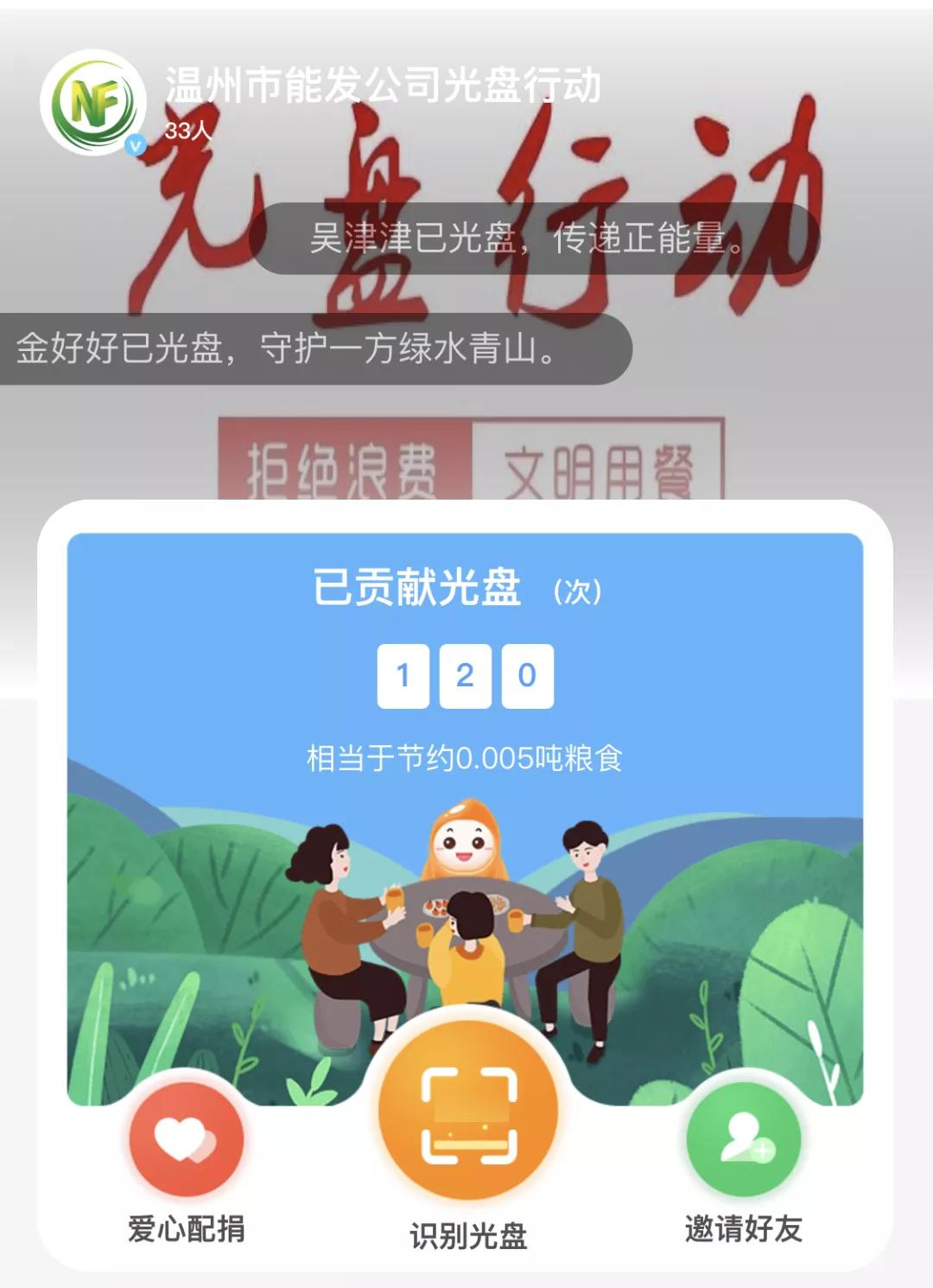 为争做新时代文明先锋,公司党支部联合综合办,号召全体职工积极投身于文明餐桌行动,利用用餐情况统计表、宣传海报、餐桌标语、“光盘打卡”等系列活动, 拒绝“舌尖上的浪费”,打造节约型绿色企业。在“光盘打卡”小程序中,公司群组已贡献光盘120次,相当于节约5kg粮食。