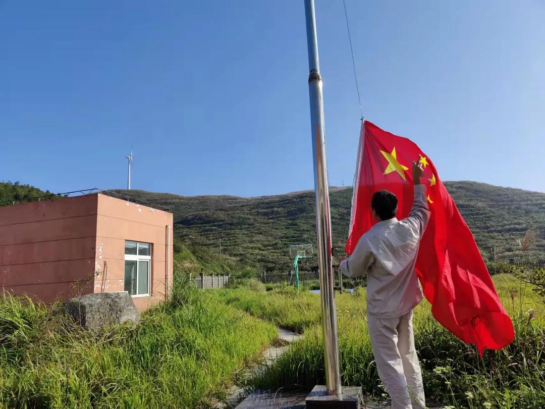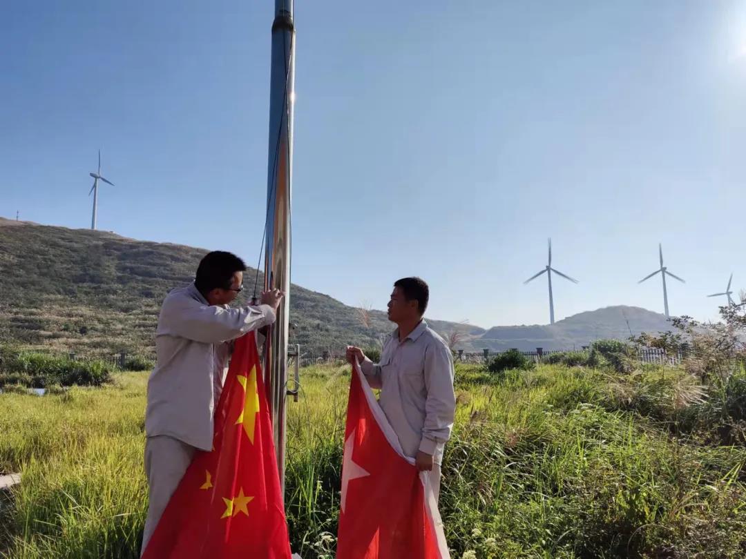 平阳西湾风电场位于平阳县鳌江镇西湾办事处、万全镇榆垟办事处、宋埠办事处交界的半天山山脊上,海拔高程600多米。国旗在山上经过风雨的洗礼,不再是鲜艳的红色。风电场的运行人员自觉地维护国旗荣誉,第一时间更换新国旗,让五星红旗升得庄严、飘得鲜艳,共同迎接祖国72周年华诞。